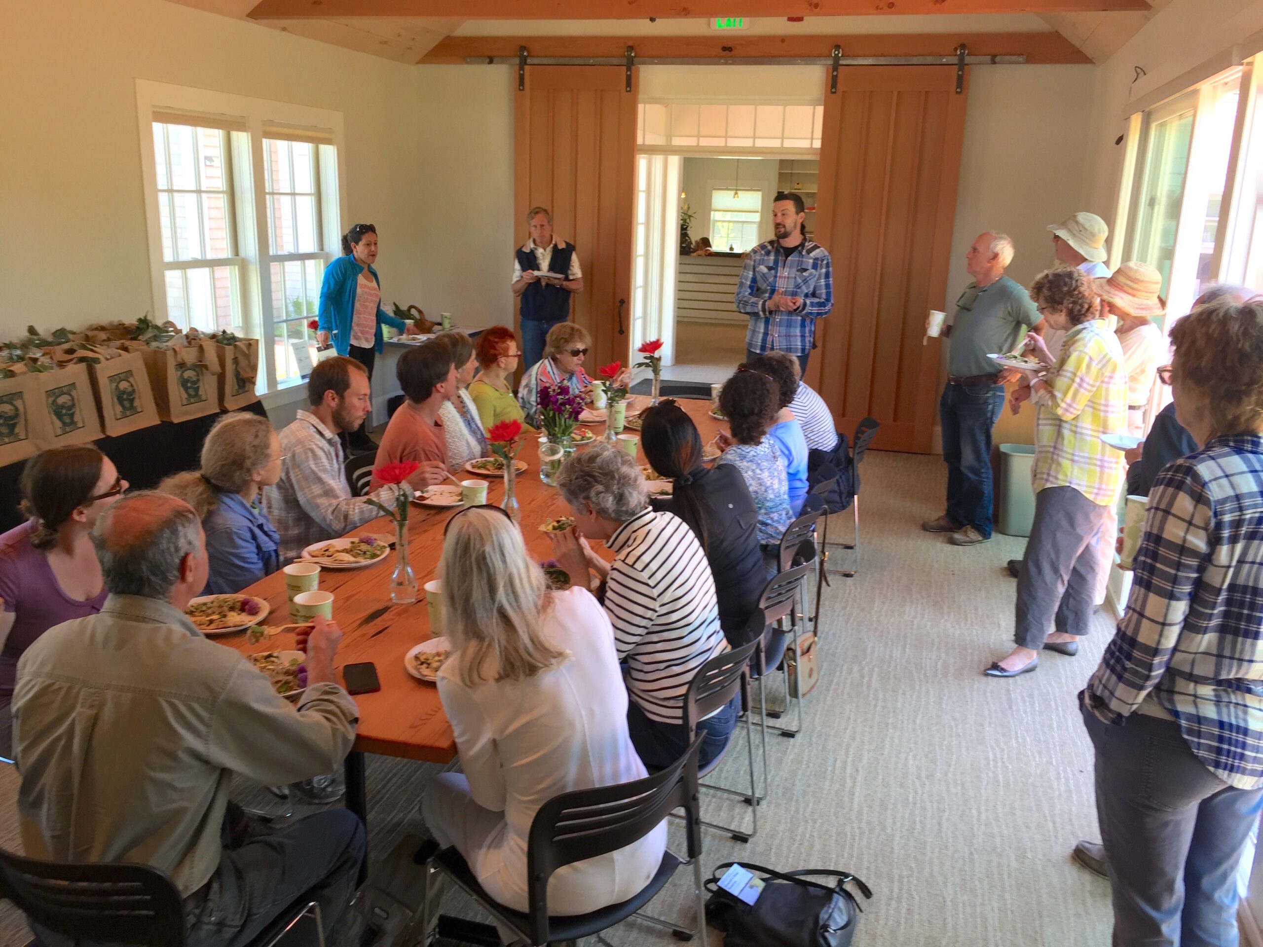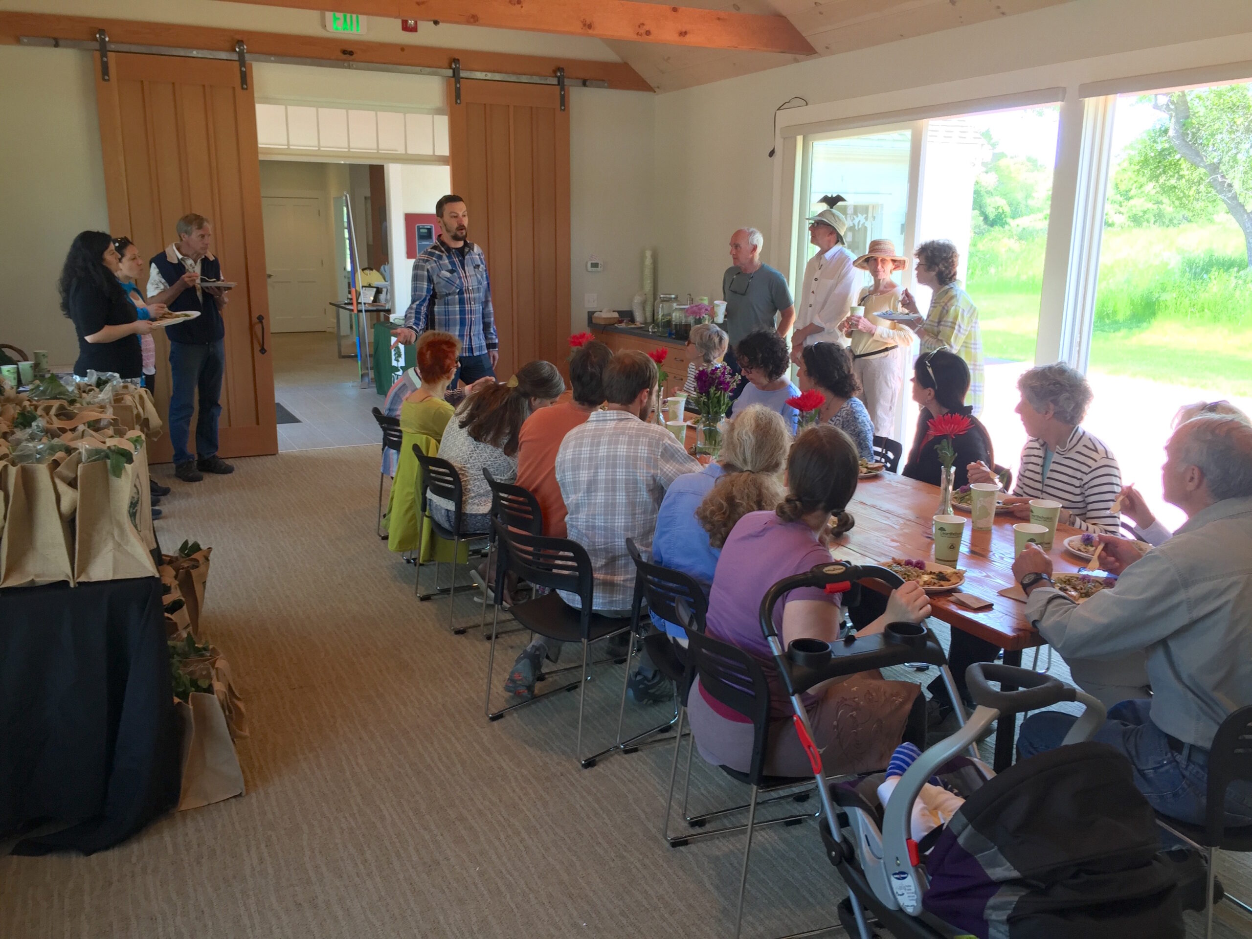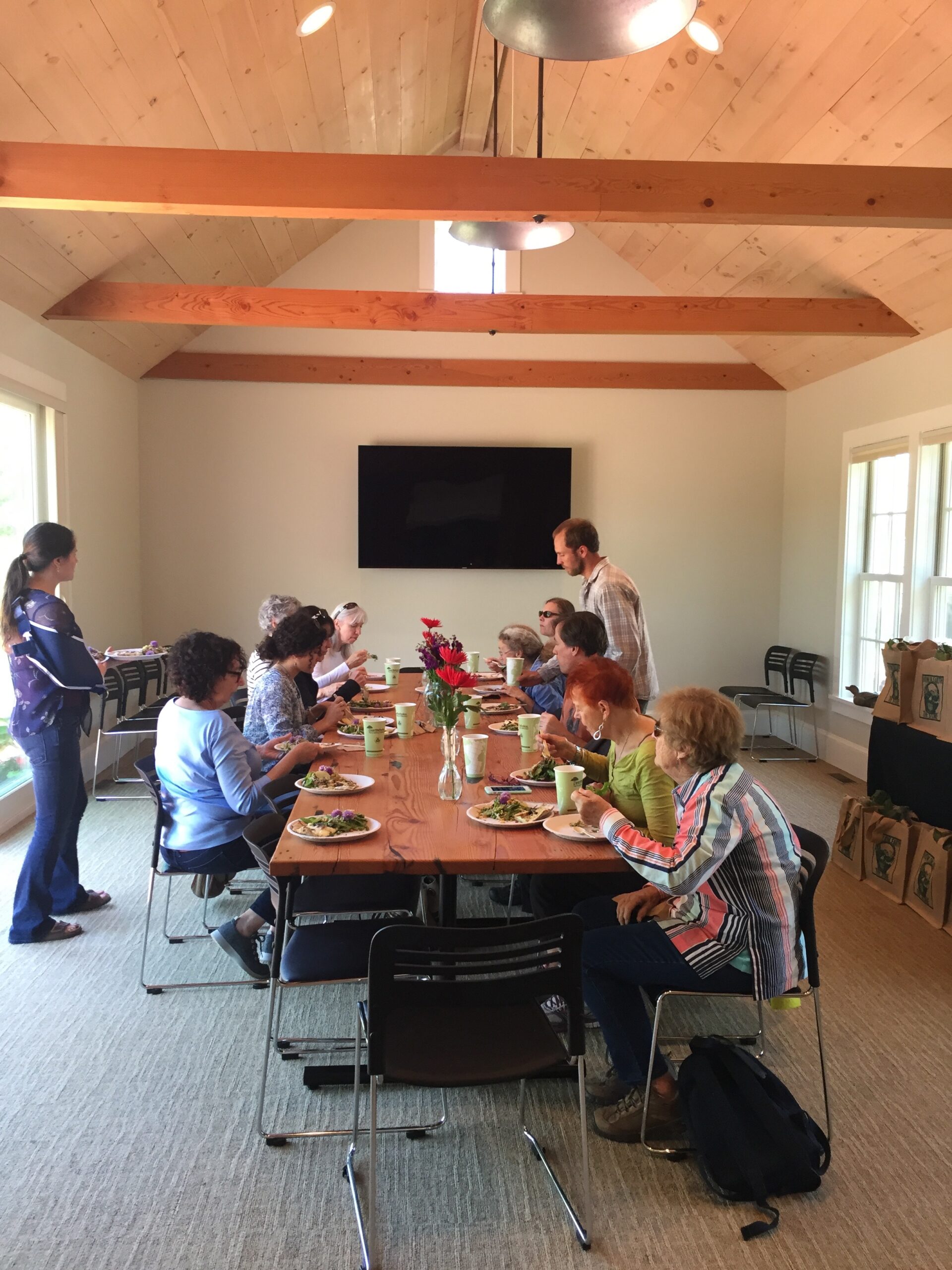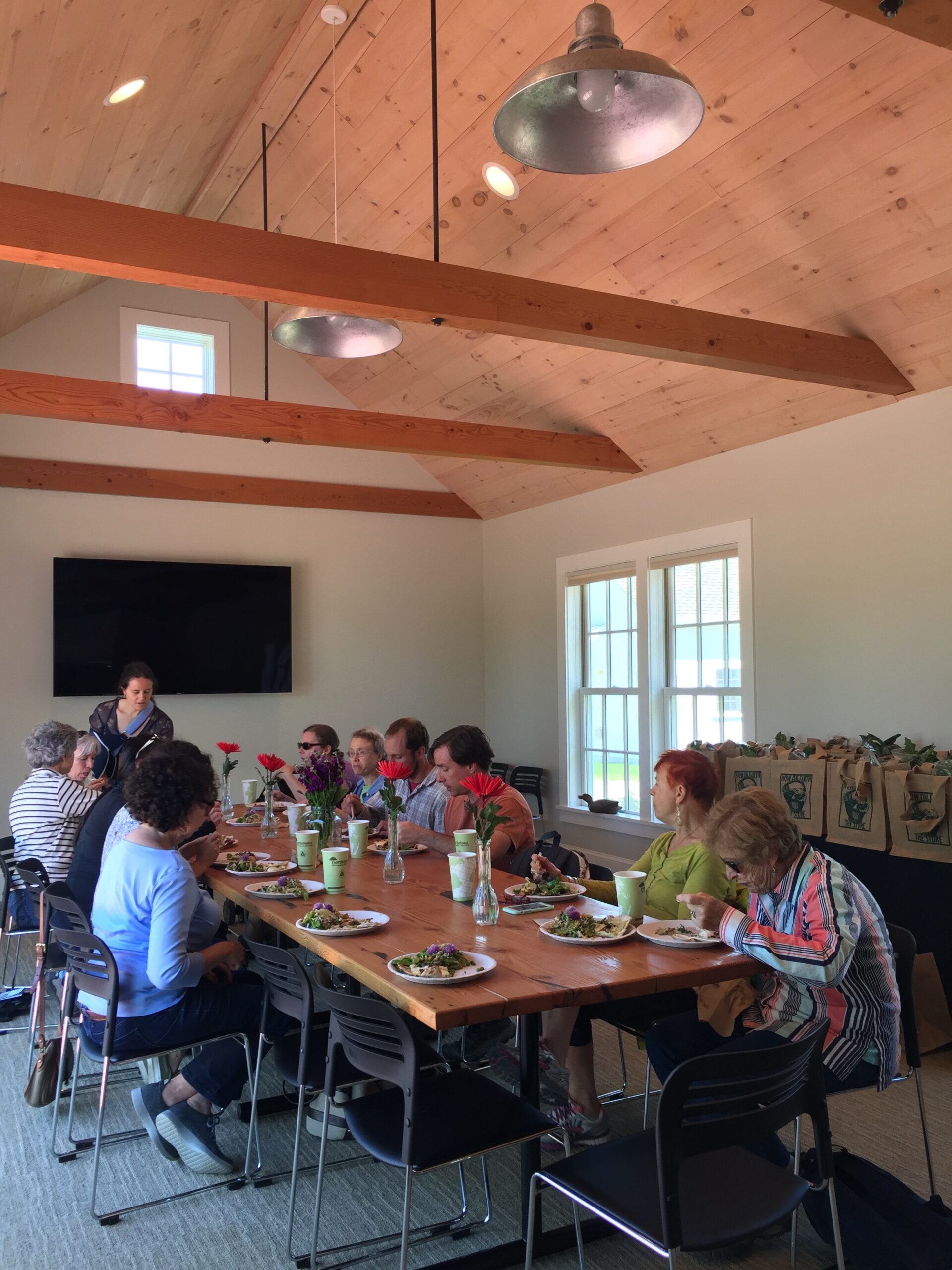 The group then traveled down the road to the rustic modern DNRT Center at Helfand Farm for an informal “trail to table” luncheon prepared and presented by Chef Edward Roszak of How on Earth in Mattapoisett. The locally sourced 3-course meal featured the herssert was herb-infused, with Dandelion Gluten Free Muffins as th a How on Earth tote bag filled with a host of items, including a reusable water bottle, a robust bundle of fresh, herbs, a card with the Dandelion Muffin recipe, and a signed copy of Brendan’s book.