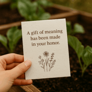 Every honor gift includes a lovingly handwritten note on recycled, plantable wildflower seed paper — a small piece of beauty that grows long after the holidays have passed.