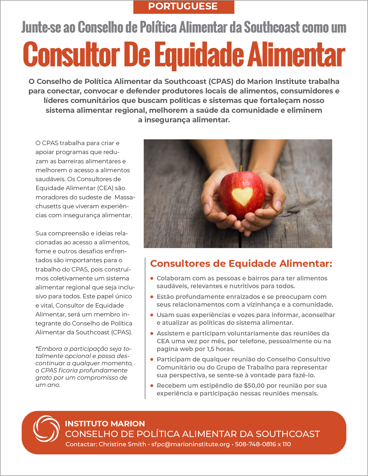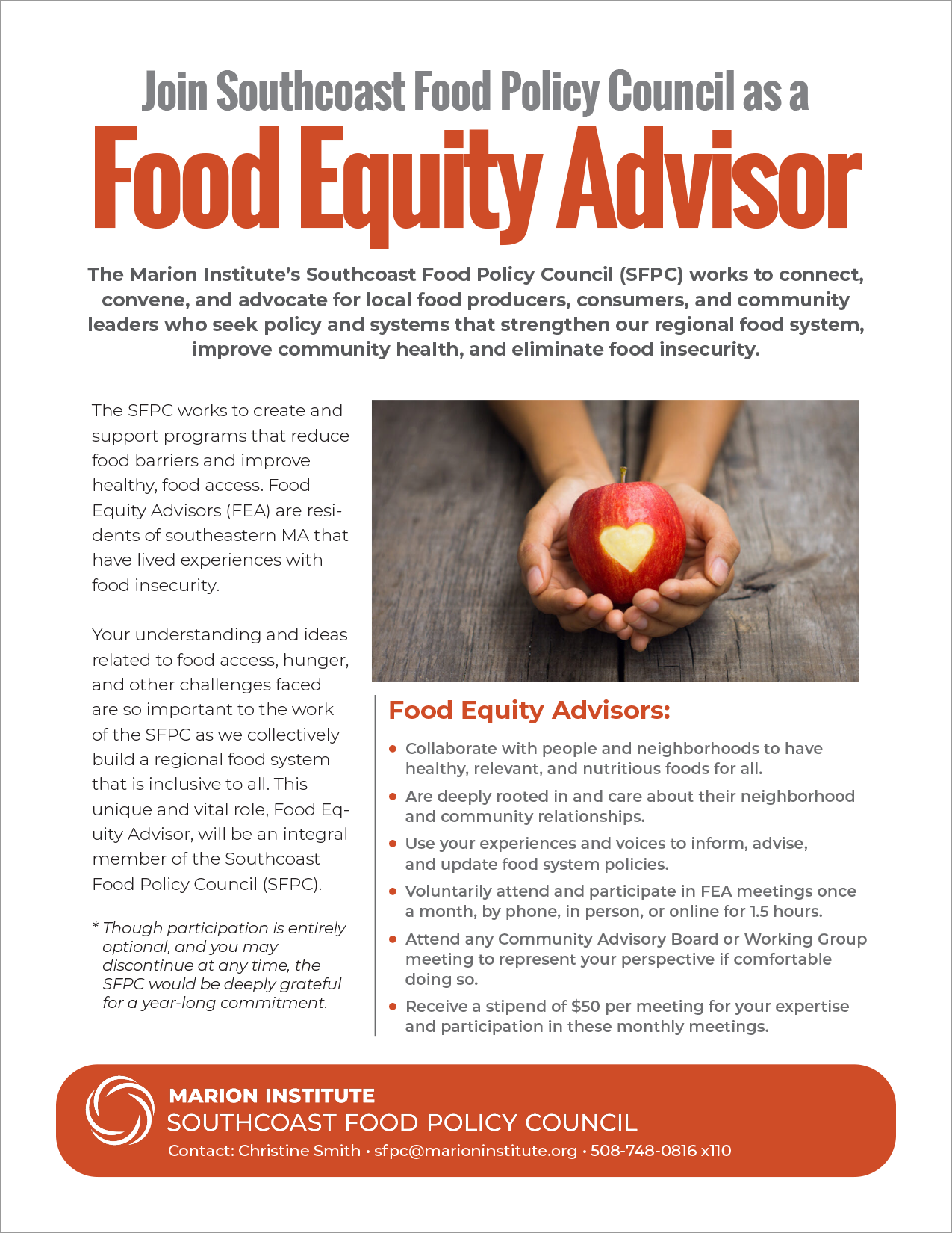 We also began meeting with our first group of Food Equity Advisors (FEAs). FEAs are residents of southeastern MA who have lived experiences with food insecurity, care deeply about their neighborhoods, and want to be agents of change. Part of the work of the FEAs will be to use their experiences and voices to inform, advise, and update food system policies. Currently, our FEAs represent Fairhaven, Fall River, and Taunton. We hope to recruit five additional advisors from Bristol, Plymouth, and Norfolk counties. If you know someone who might be interested, please get in touch with us atsfpc@marioninstitute.orgor call 508-748-0816 x 110
