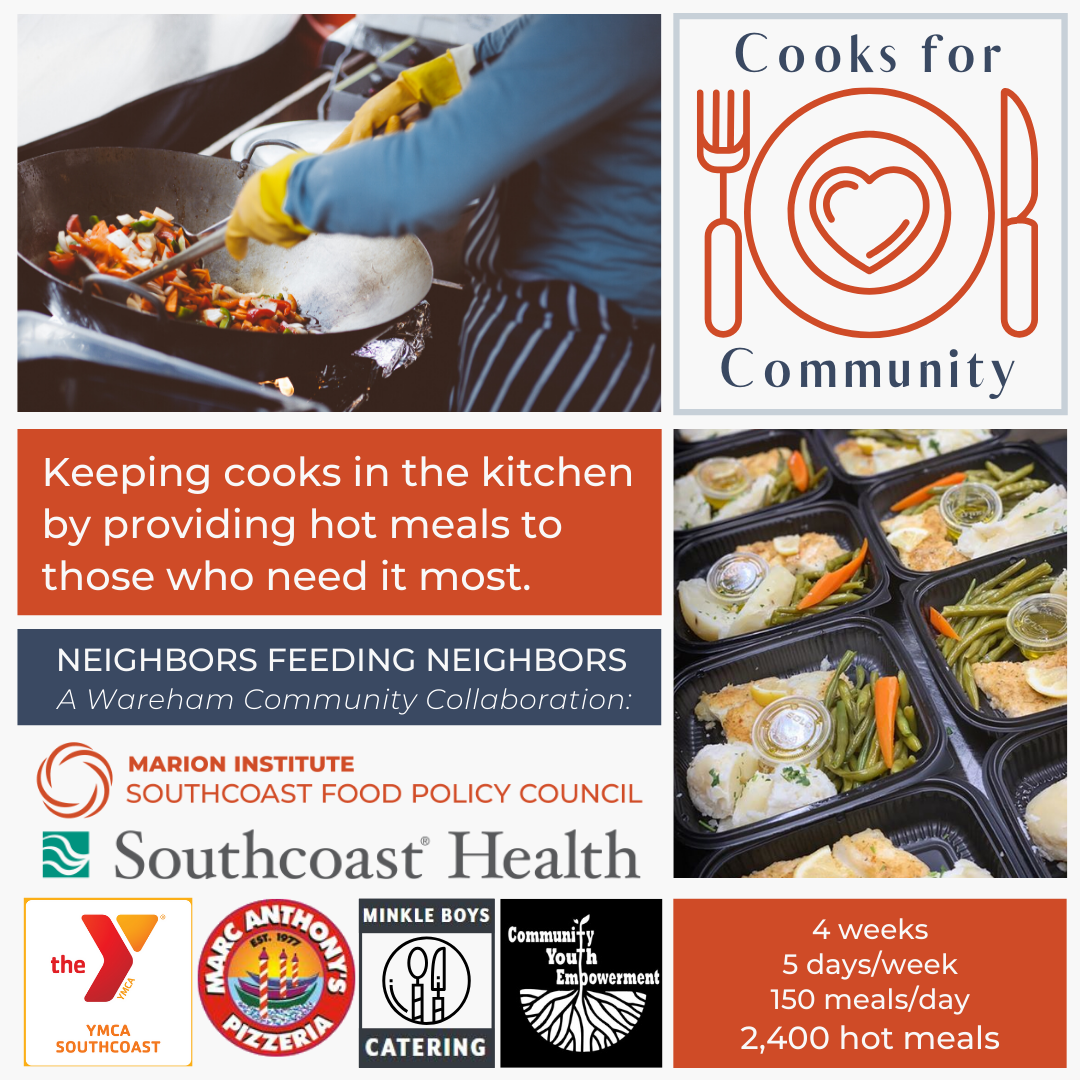 MARION, MA – Neighbors feeding neighbors. The Marion Institute Southcoast Food Policy Council (SFPC) has launched “Cooks for Community,” a community-specific collaboration that works with service organizations and local restaurants in the Southcoast to ensure that at-risk populations have access to food from safe sources.